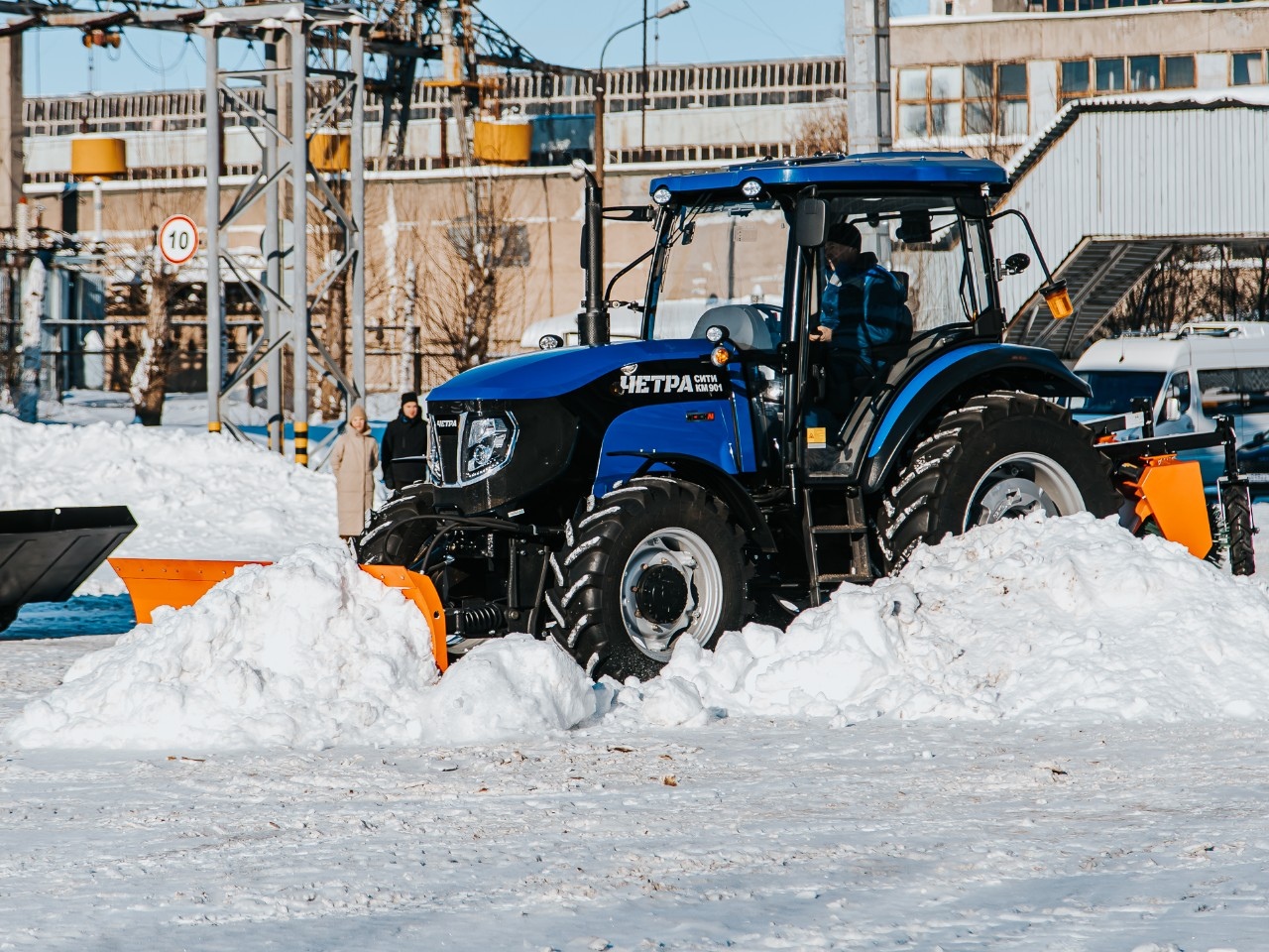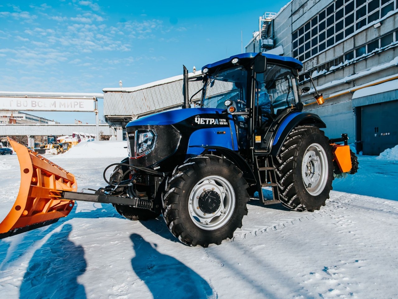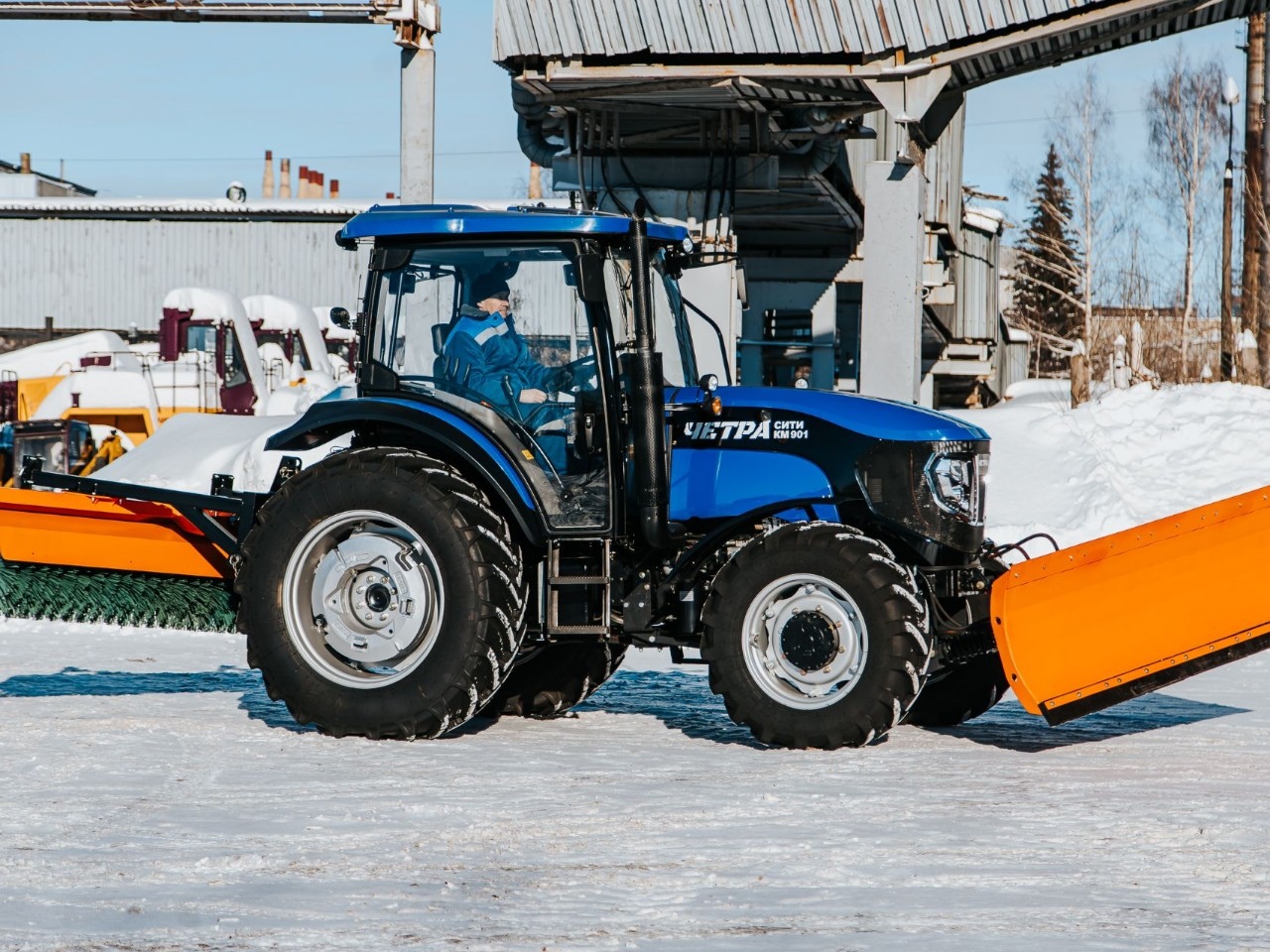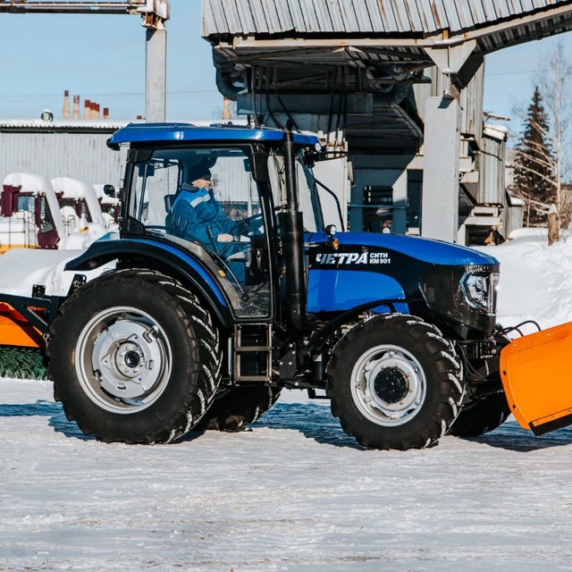 Коммунальная машина КМ 901 с тяговым классом 1,4, комплектуется универсальным гидроповоротным отвалом, а также иным опциональным навесным оборудованием, в т. ч. коммунальной щеткой механической без/с системой полива.